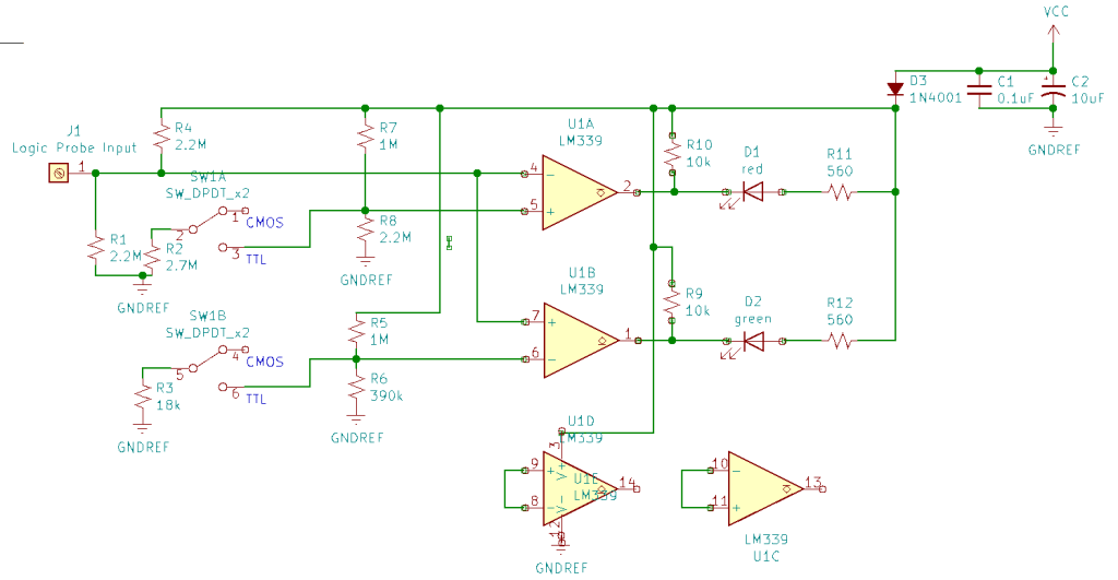 For TTL circuits, we will close the switch, which will put a couple more resistors in parallel to those that make the voltage dividers. These new resistors, when the probe is powered with 5V from the circuit under test, will make sure that the reference voltages will be the ones for the TTL circuits: 2.3V for the 1 and 0.08V for the 0.