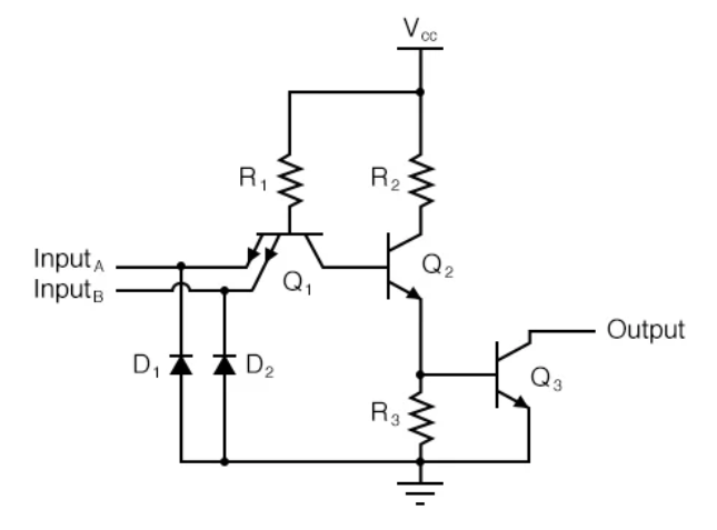 With the bipolar transistors we can build logic circuits usually named TTL, or Transistor-Transistor Logic. These circuits are essentially made of transistors and resistors.